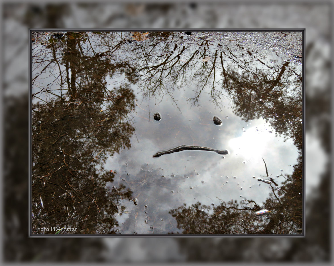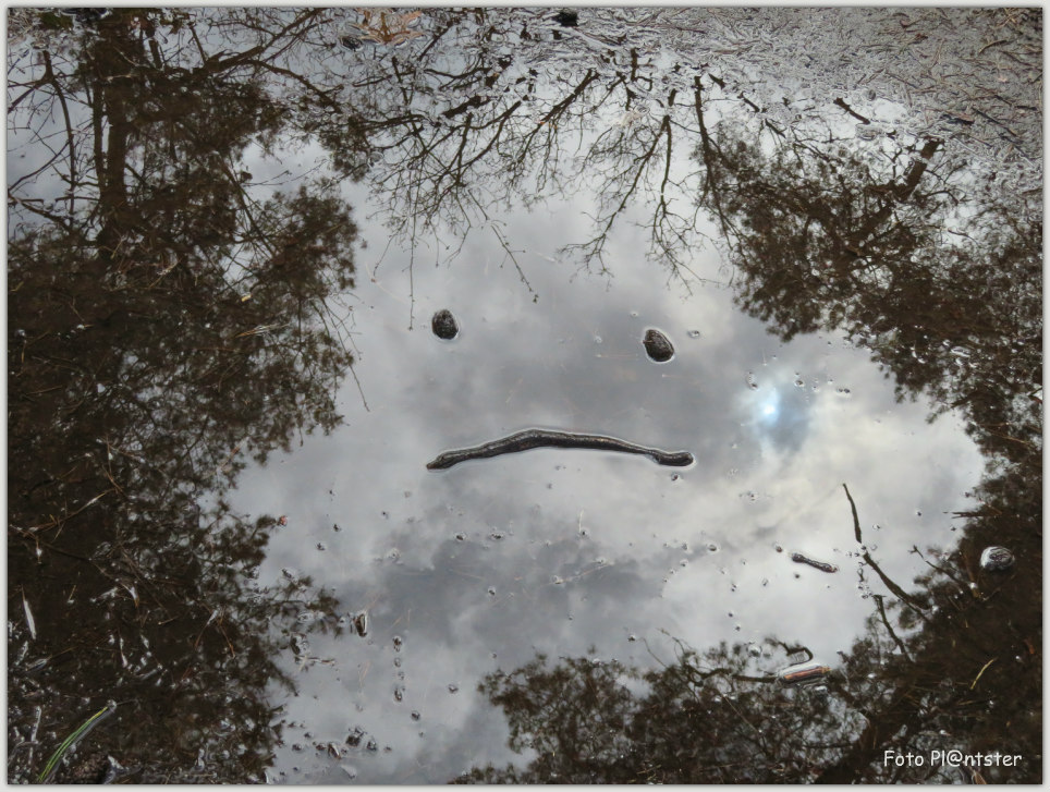 *Met klik op desbetreffende foto voor eventuele vergroting. Tijdens de hond uitlaten 12-04-2023 en om je erover uit te laten Niks zo veranderlijk als het weer op vandaag de dag vergeleken met gisteren... Grote plassen water op je pad gevuld met het regennat een weerspiegelend beeld hetgeen niet gauw verveeld Je hoeft er niets aan toe te voegen het behoeft weinig woorden Het grappige ervan hoe 't geheel er bij lag klaarblijkelijk uitgesproken Je liet het je welgevallen De gevallen regen liet van zich spreken heb mijn ogen uitgekeken ik zag het luchtig in 't Lag gewoonweg voor je neus met enig fantasie het oog op twee dennenappels twee ogen en een mond overdwars een stokje hoe mooi kan zoiets al zijn 😀 Groet Plantster