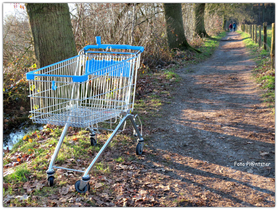 Foto 2.Een winkelkar, vergeten, daar in het gras,