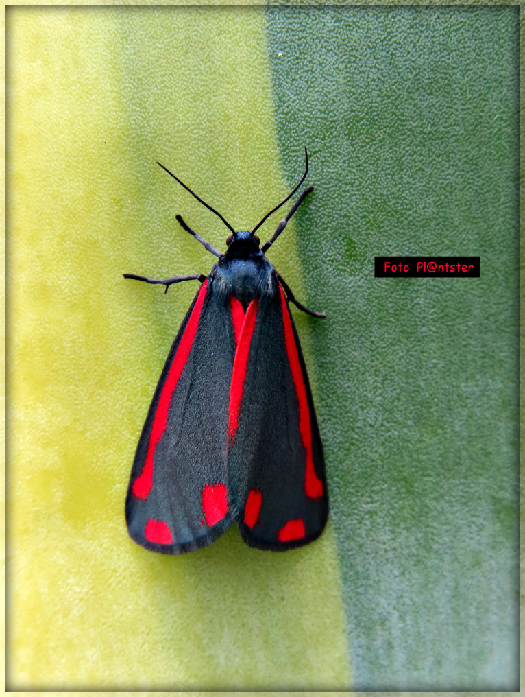 Met zwarte vleugels en felrode strepen.