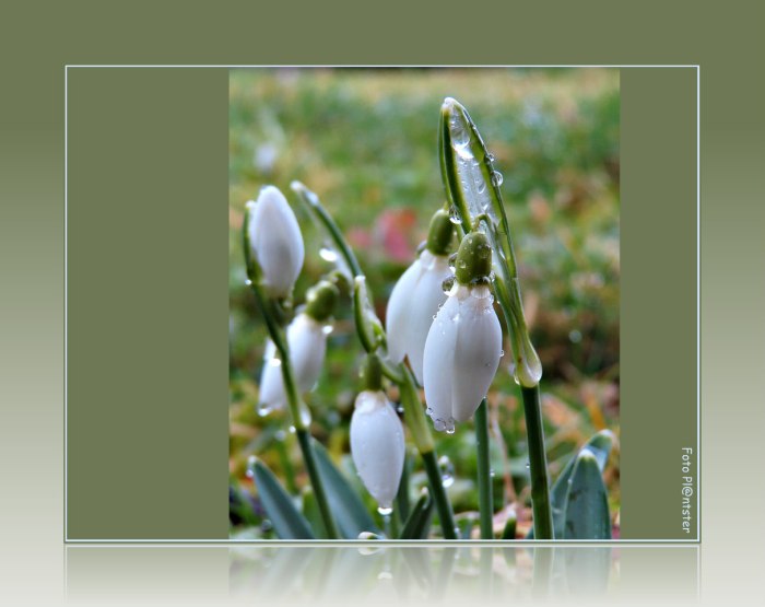 Vanmorgen zag ik ze voor het eerst dit jaar: sneeuwklokjes. Ze stonden er al, klein en vanzelfsprekend, alsof ik degene was die te laat kwam. Tussen grauw gras en natte aarde bogen zij hun witte hoofdjes. Aan hun randen hingen regendruppels, als glazen kralen. De kleine klokjes luiden niet luid, maar het was mij duidelijk. Die druppels verraadden het weer: geen belofte van lentezon, maar een lucht die nog laag hing.