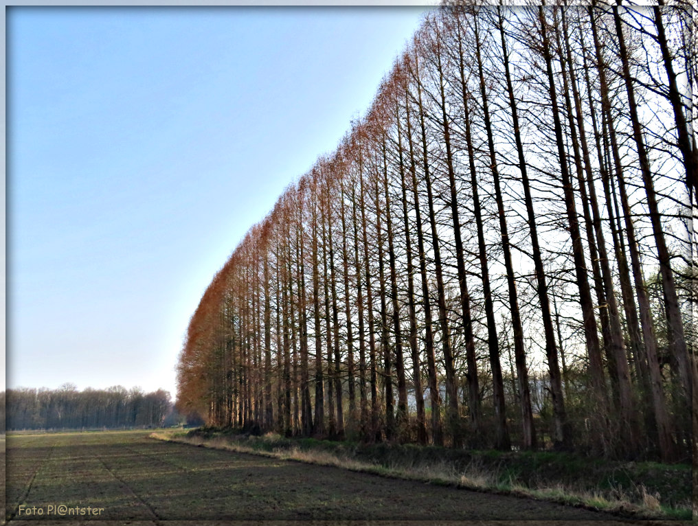 Foto 2. Hoge bomen naast elkaar staan zij samenhorig schouder aan schouder, om daar de wind een halt toe te roepen. Daar kan een mens een voorbeeld aan nemen: sta schouder aan schouder, wees er voor elkaar niet alleen als het goed gaat, maar ook als het minder gaat In lief en leed, in momenten van wind én zon