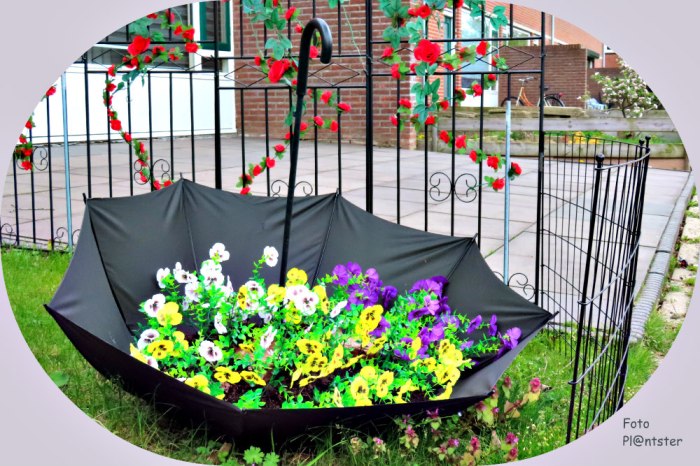 Dat is een goed idee voor een paraplu die je niet meer kunt gebruiken. Doet die toch nog dienst als plantenbak.