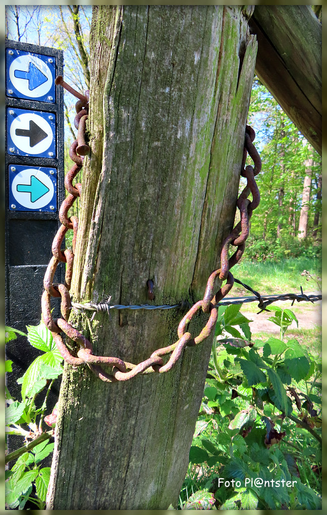Foto 1.Ik zag iets roods op de grond, onder een zomereik Ik stond even stil, alsof ik iets had betrapt en het nu pas voor de eerste keer zag. Foto 2.Een oude weipaal droeg een ketting, verroest met charme. Tijd had er kleur aan gegeven, en het gelaten zoals het nu is. Foto 3.Op weg naar de parkeerplaats hoorde je kabaal hoog in de bomen. Het leken twee ganzen te zijn op zoek naar een tak Zo goed als onzichtbaar, alsof de bomen even een vijver waren geworden. De foto is niet zo duidelijk als ik zou willen...